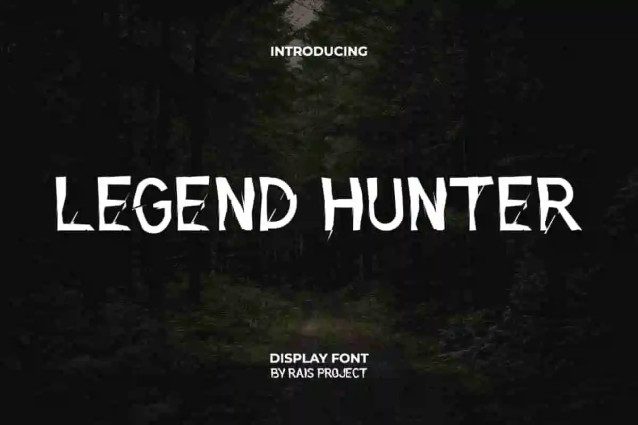 Legend Hunter Font is a creepy creative display font, by RaisProject. This font resembles a piece of wood that has been sliced or cut randomly, giving it a look that will give you goosebumps. It will be good for custom design, label, poster, invitation, signage, cover, menu, brand image, product packaging, quotes, stationery, web, and more!