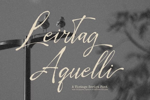 Leirtag Aquelli Font | Vintage Script, from Denustudios, suitable for any projects such as: logos, branding projects, homeware designs, product packaging, mugs, quotes, posters, shopping bags, t-shirts, book covers, name card, invitation cards, greeting cards, label, photography, watermark, special events, and all your other lovely projects that need a Vintage Script taste.