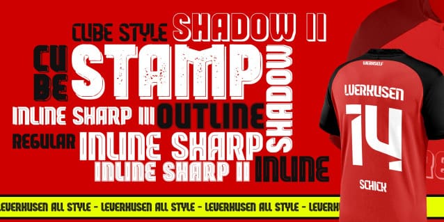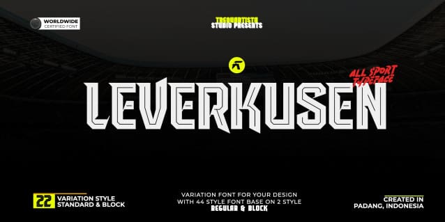 Leverkusen Font is a fearless athletic font family. It’s perfect for sports logos, branding, posters, apparel design with it’s bold and confident appearance. The uppercase characters comes with different renders to add authenticity and a more natural worn look.