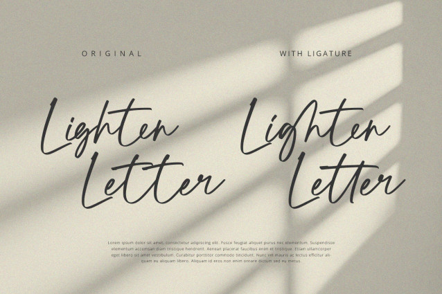 Lighten Script Font is a handwritten script font with chic and modern feels. It will be perfectly used for Branding, Logo Design, Lettering, Logotype, Clothing, Poster, magazine, packaging, posters, shopping bags, t-shirts, book covers, photography, special events and other design project.