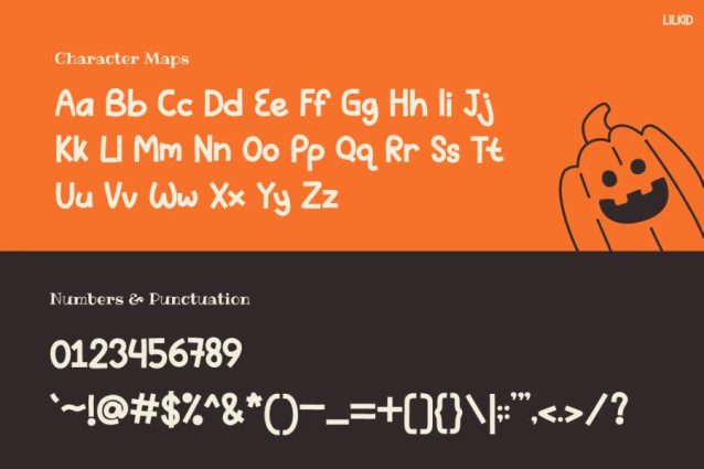 This font combines bold lines with soft, rounded shapes, making it easy to read and enjoyable to use. Therefore, it’s perfect for playful projects that need a touch of Halloween spirit. Imagine happy pumpkins, cute ghosts, and smiling monsters all dancing on your screen — that’s exactly the mood LILKID brings to your designs.