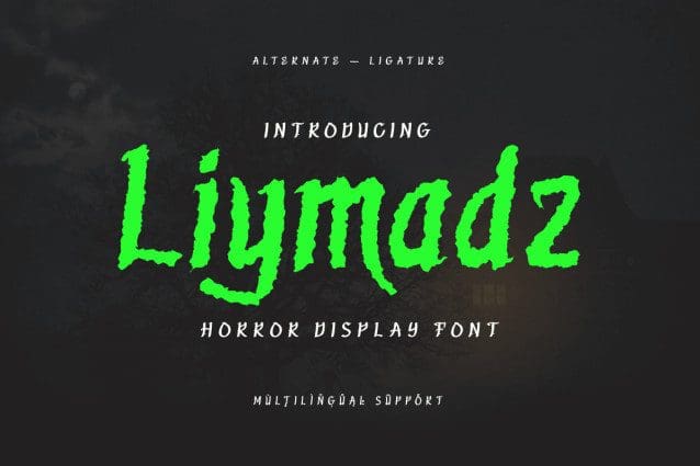 Liymadz Display Font, a horror display font that sends shivers down your spine. Each letter drips with sinister allure, invoking a sense of dread and mystery. Perfect for Halloween designs, movie posters, or eerie-themed projects, Liymadz brings a spine-chilling atmosphere to your creations, leaving a lasting impression on anyone who dares to gaze upon them.
