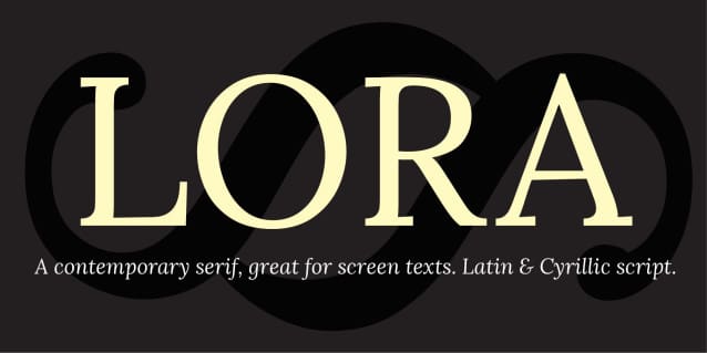 The general typographic voice of Lora flawlessly conveys the temper of a modern-day tale, or an art essay. Technically Lora is optimised for display appearance, and will work equally very well in print.