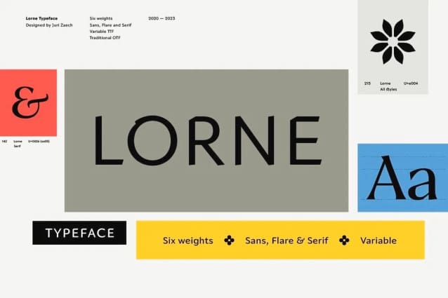 Lorne Font is available in six weights and three distinct styles—Sans, Flare, and Serif—and is carefully kerned. The full family is consolidated into a single variable font.