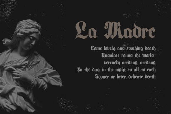 Luminados Fraktur Blackletter Font. This font was inspired by classical fraktur made in the middle of the 19th century, which featured strong contrast and artistic lines. The font is well-suited for classical headlines, advertising, or artistic purpose. But with your creative idea, you can use this font to make your project outstanding and elegant.