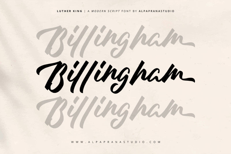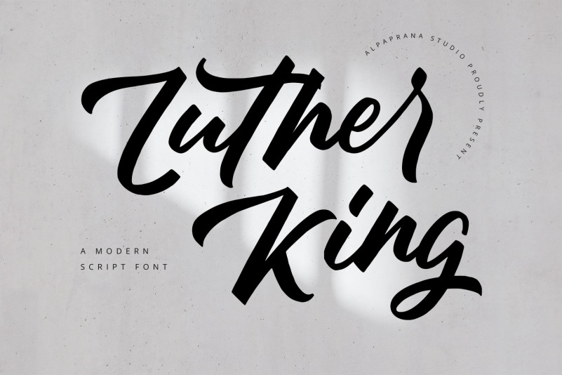 Luther King Script Font is a modern script font with natural and modern feels. It will be perfectly used for Branding, Logo Design, Lettering, Logotype, Clothing, Poster, magazine, packaging, posters, shopping bags, t-shirts, book covers, photography, special events and other design project.