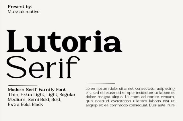 Lutoria Serif Font is a modern and elegant serif font family designed with sophistication and versatility in mind. Featuring 9 styles, from the delicate Thin to the bold and striking Black, Lutoria Serif is perfect for various design needs, including editorial layouts, branding projects, and digital typography.