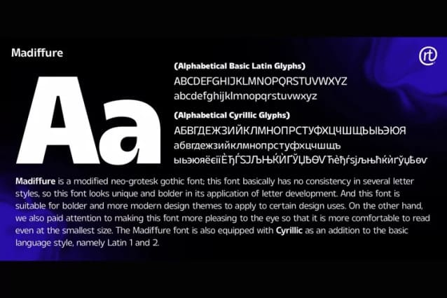 On the other hand, we also paid attention to making this font more pleasing to the eye so that it is more comfortable to read even at the smallest size. The Madiffure font is also equipped with Cyrillic as an addition to the basic language style, namely Latin 1 and 2.