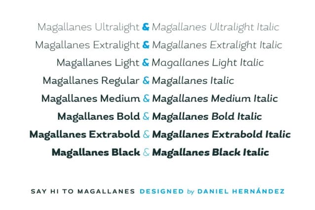 Magallanes Font Family, a contemporary neo-humanist sans serif font designed by Daniel Hernández. Its strokes and terminals are related to the calligraphic strokes from humanist typefaces. It comes with 8 styles, from Ultra Light to Black, each with its true italics. Every weight comes with alternative glyphs for a more dynamic use. Magallanes is the perfect titling font to complement text faces in magazines, logotypes, etc.