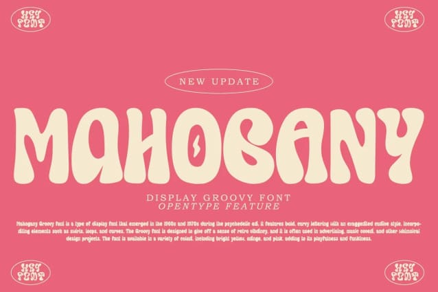 Mahogany Display Font, is a type of display font that emerged in the 1960s and 1970s during the psychedelic era. It features bold, curvy lettering with an exaggerated cursive style, incorporating elements such as swirls, loops, and curves. The Groovy font is designed to give off a sense of retro vibrancy, and it is often used in advertising, music covers, and other whimsical design projects. The font is available in a variety of colors, including bright yellow, orange, and pink, adding to its playfulness and funkiness.