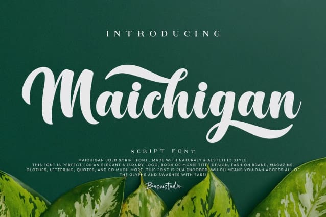 Maichigan Font – Bold Script Font, made with Naturaly & Aestethics Style. This Font is perfect for an elegant & luxury logo, book or movie title design, fashion brand, magazine, clothes, lettering, quotes, and so much more. This font is PUA encoded, which means you can access all of the glyphs and swashes with ease!