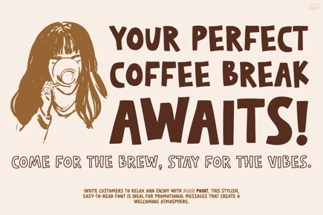 Main Point works especially well in modern marketing and social content. For example, as shown in the Instagram and flyer samples, it fits perfectly with coffee themes and lifestyle messaging. Additionally, the bold letters contrast beautifully with light backgrounds, making every post more eye-catching. It is ideal for headlines, announcements, quotes, and promotional materials. Thanks to its soft edges and hand-drawn look, it delivers a relaxed yet confident tone. Consequently, it adds joy to your words while keeping them readable and bold.