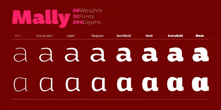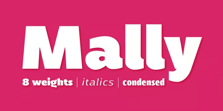Mally Font is a family of humanist fonts, sans serif with 32 styles, variable with 08 normal and condensed weights and their respective italics, with 594 characters in each font, offers alternative characters, was conceived as a variable font encompassing various weights and widths. Characterized by its excellent readability even in the smallest sizes, with a contemporary design it has a wide support of Latin languages.