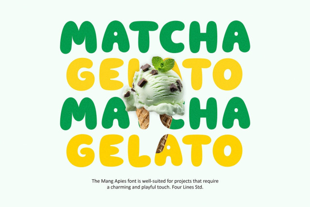 Mang Apies Font, a display font with rounded, balloon-like curves that create a warm and playful vibe. Perfect for designers looking to inject a bit of joy and personality into their work, this font offers a friendly and modern look that suits a wide range of creative projects.