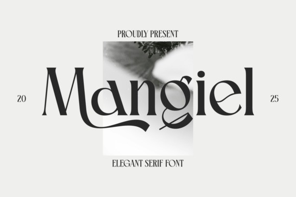 Mangiel Font, a new elegant serif font from the year 2025. An artistic, black and white photograph is layered behind the font name, adding a chic, high-fashion quality to the presentation. The font itself showcases unique and flowing ligatures.
