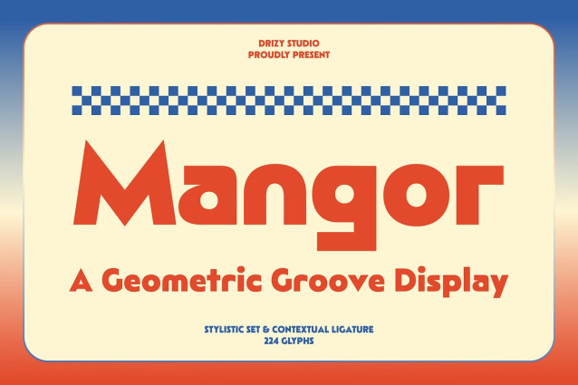 Mangor Font – Geometric Groove Display Font is a bold typographic dancefloor where geometry meets groove. With its clean, angular lines and rhythmic curves, Mangor pulses with retro futuristic energy, perfect for designs that demand attention and movement. Inspired by the vibrant aesthetics of 70s Geometric Disco and the precision of modern minimalism, this display font bridges eras with confident charm. Step into the spotlight, Mangor brings the beat and ready to groove.