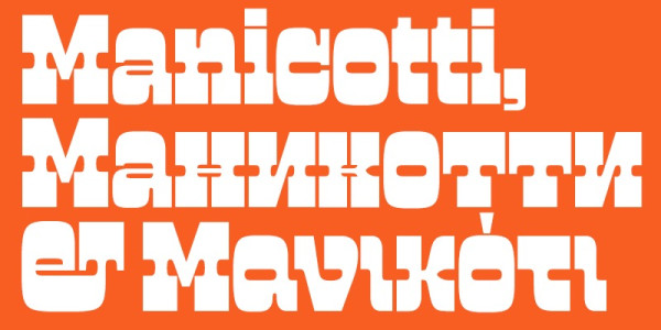 Manicotti Font is a retro slab serif typeface that captures the timeless charm of the Western cowboy era. Inspired by 19th century gnarled wood type, Manicotti takes the ornamentation of the reverse-contrast French Clarendon style to the extreme. Its thick upper and lower stems and generous serifs create an eerily dense typographic texture reminiscent of spaghetti westerns, rough roads and bombastic saloons.
