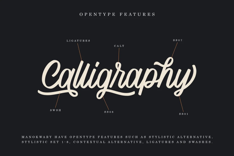 Manokwary Script Font is a clean script with opentype feature. Manokwary created from brush pen with basic technique. it’s perfect for a wedding invitations, save the date cards, fine art papery, feminine branding or personal gift cards.
