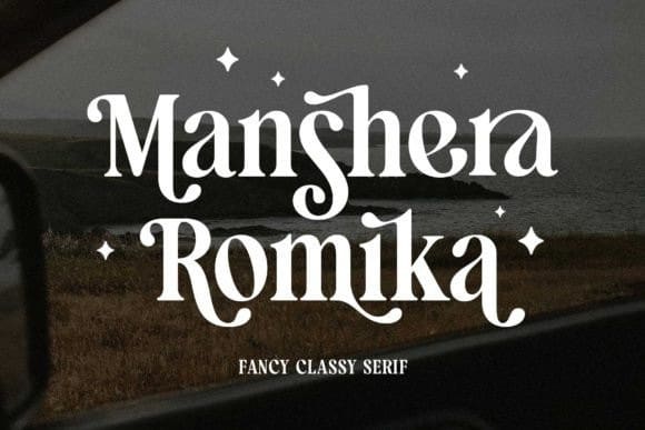 Manshera Romika Font, a modern classy bold serif font. Beautiful masterpiece with lots of special characters that bring you to a modern-vintage design with a sexy thick shape. This font represents a sophisticated touch, perfect for a minimalist theme, elegance, and cheerfulness. 500+ Glyphs worth for your design project!