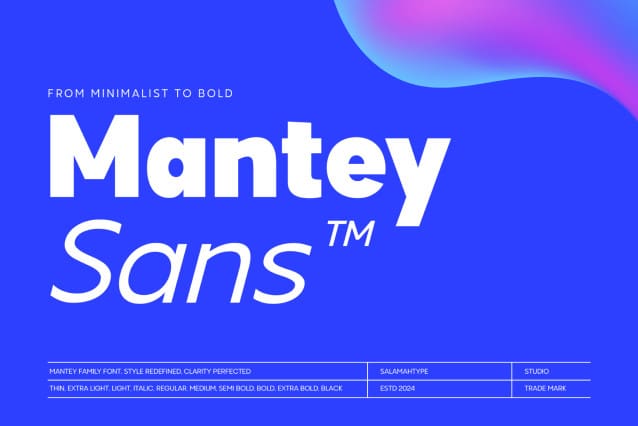 Mantey Sans Family Font a versatile and comprehensive sans-serif font family designed by Aswangga from Salamahtype Studio. With its clean lines and modern aesthetic, Mantey is perfect for a wide range of applications, from logos and headlines to body text in various media. This font family includes a total of 18 fonts, featuring weights from “Thin” to “Black,” each with a corresponding italic version, providing designers with the flexibility to create visually compelling content.