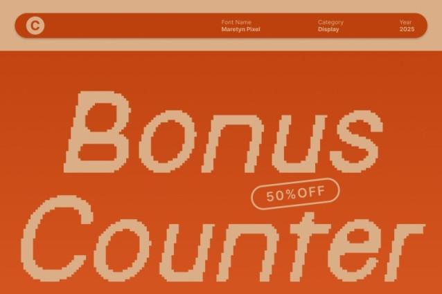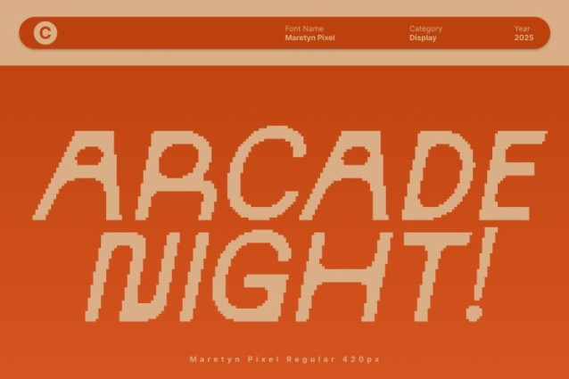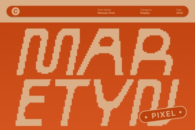 Maretyn Pixel Font This is a brutalist sans serif font that blends sharp geometry with a gritty digital twist. Its angular cuts, firm structure, and unconventional forms create a commanding visual rhythm that instantly captures attention. The pixel texture amplifies its industrial tone, giving every character a unique digital personality that stands out in modern design environments.
