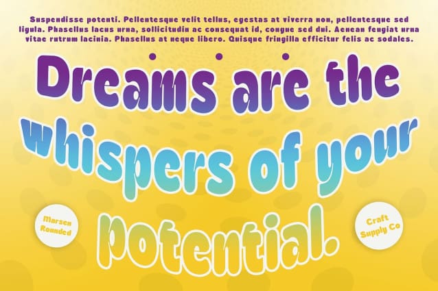 Marsen Rounded Font is a modern sans serif font that features thick, rounded shapes combined with innovative inktrap designs, capturing a cute and funky 90s vibe. Its bold, rounded form not only creates a cheerful impression but also ensures high visibility, making it an excellent choice for lively and engaging designs. The rounded edges soften the overall look, giving the font a friendly demeanor that draws the viewer in.