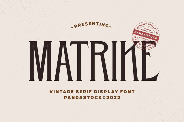 Matrike Font is a tall condensed serif font designed for bold headlines and nostalgic packaging. Its letterforms feature strong vertical strokes, sharp wedge serifs, and high stroke contrast, reminiscent of early 1900s sign paintings and art deco headlines.