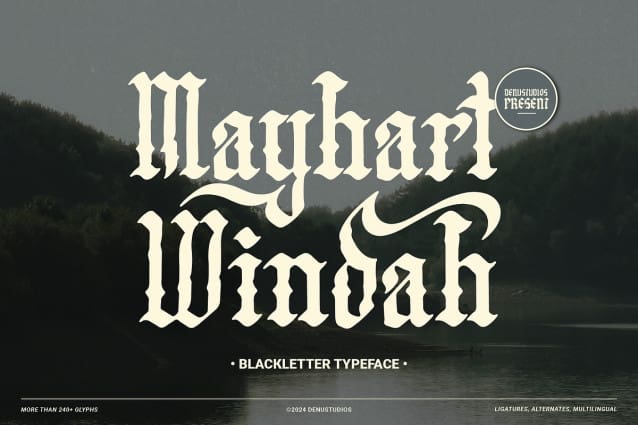 Mayhart Windah Font | Blackletter Typeface, from Denustudios, suitable for any projects such as: logos, branding projects, homeware designs, product packaging, mugs, quotes, posters, shopping bags, t-shirts, book covers, name card, invitation cards, greeting cards, label, photography, watermark, special events, and all your other lovely projects that need a Blackletter Typeface taste.