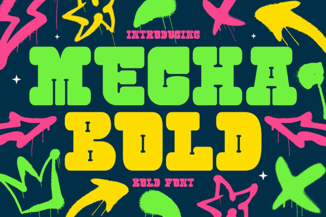Mecha Bold Font, a vibrant and energetic typeface designed for those who want to make a statement. This bold, slab-style display font brings a retro-futuristic vibe with its thick, rounded letterforms and industrial-inspired slab details. The combination of bright neon green and electric yellow against a dark navy background creates a high-contrast, eye-catching appeal. Complemented by graffiti-style arrows, stars, and splashes, Mecha Bold exudes a youthful, street-art energy that makes it perfect for urban branding, music covers, social media graphics, posters, and merchandise. The bold, chunky aesthetic ensures that every word stands out, making it a great choice for logos, packaging, and advertising that need a fun yet impactful touch.