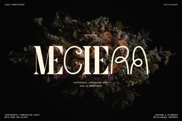 Meciera Font | Combination Serif, from Denustudios, suitable for any projects such as: logos, branding projects, homeware designs, product packaging, mugs, quotes, posters, shopping bags, t-shirts, book covers, name card, invitation cards, greeting cards, label, photography, watermark, special events, and all your other lovely projects that need a Combination Serif taste.