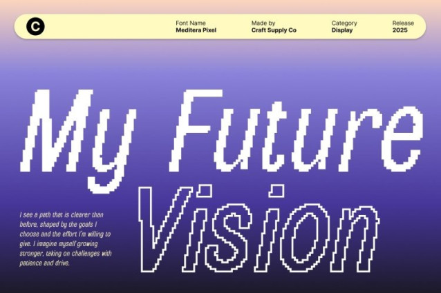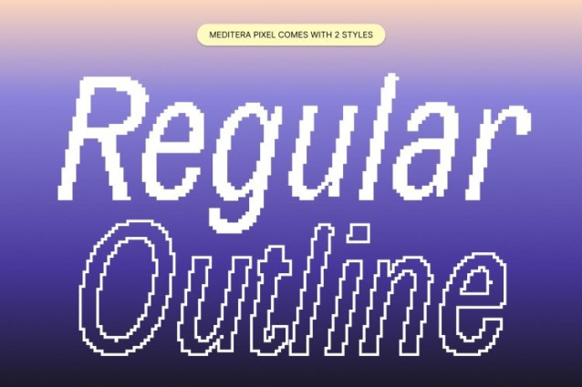 Meditera Pixel Font This is a condensed sans serif display font designed to deliver strong visual impact even in tight spaces. Its narrow, streamlined letterforms allow for efficient use of space without compromising readability, making it ideal for bold headlines, posters, and branding projects that demand attention and clarity.