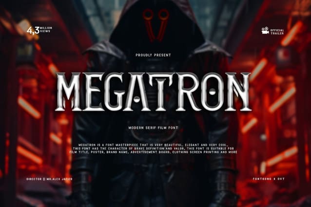 Megatron Font, a modern serif film font designed to exude cinematic majesty. With its commanding presence and bold serifs, Megatron brings power and sophistication to your film titles, posters, and promotional materials.