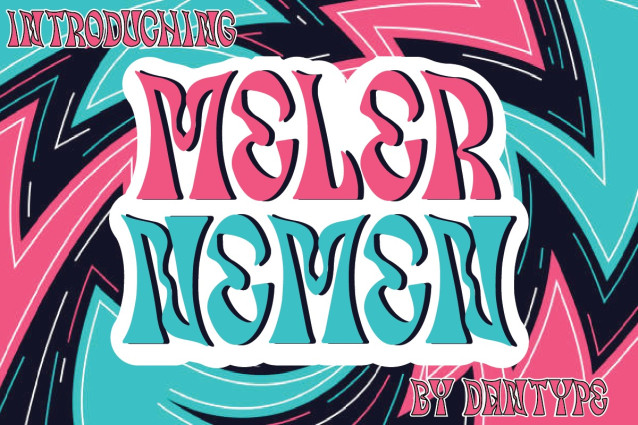 Meler Nemen Psychedelic font. This font would be perfect for photography, watermarks, social media posts, advertisements, logos & branding, invitations, product design, labels, stationery, product packaging, special events, and other projects.