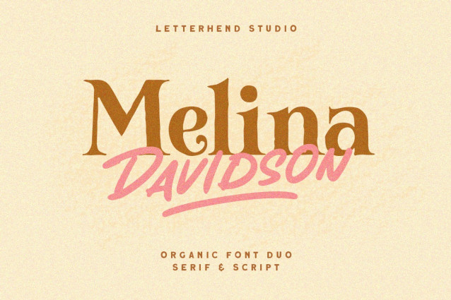 Melina Davidson Font Duo is a font duo package contain a stylish serif with organic script. This font duo is purposely made for headline, display or logotype, and signature which need a standout appearing. This font perfectly made to be applied especially in logo, and the other various formal forms such as invitations, labels, logos, magazines, books, greeting / wedding cards, packaging, fashion, make up, stationery, novels, labels or any type of advertising purpose.