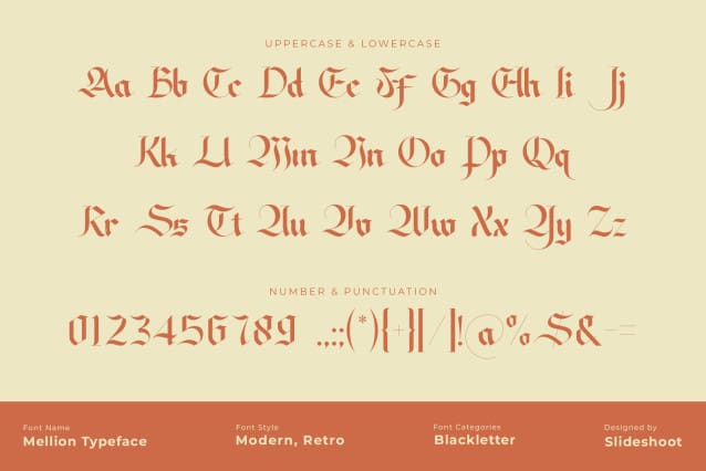 Mellion Blackletter Font is a balanced, smooth, elegant and blackletter font. He has a beautiful character. It fits perfectly with invitation card designs, company logos, movie titles, movie names, business cards, book titles, brand names and various other designs. Mellion Blackletter is a subtle blackletter font that exudes sophistication and elegance. Its stylish alternations and ligatures make this font the perfect partner for any project.