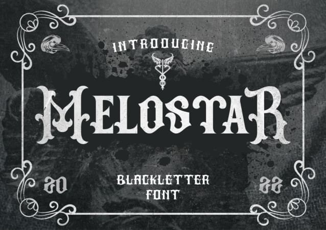 Melostar Blackletter Font, a one-of-a-kind blackletter decorative font. This font is perfect for a wide range of projects, including gothic lettering, tattoos, headlines, posters, magazines, newspapers, t-shirts, labels, and any other design that requires a striking typeface. Melostar adds a distinctive touch to your designs, making them truly stand out.