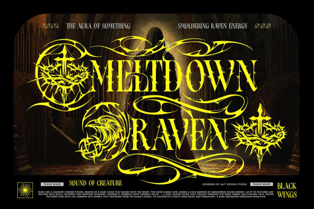 Melted Stigma Font a typeface that exists where classic Blackletter meets chaotic fluidity. This is not merely a font; it is a visual manifestation of “smoldering raven energy.” Melted Stigma merges the historic solemnity of gothic calligraphy with a modern, aggressive twist—letters that appear to be melting, bleeding, and twisting into razor-sharp thorns.