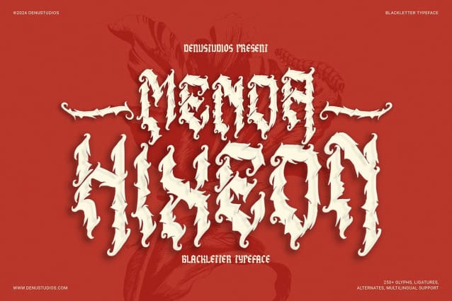 Menda Hixeon | Blackletter Typeface, from Denustudios, suitable for any projects such as: logos, branding projects, homeware designs, product packaging, mugs, quotes, posters, shopping bags, t-shirts, book covers, name card, invitation cards, greeting cards, label, photography, watermark, special events, and all your other lovely projects that need a Blackletter Typeface taste.