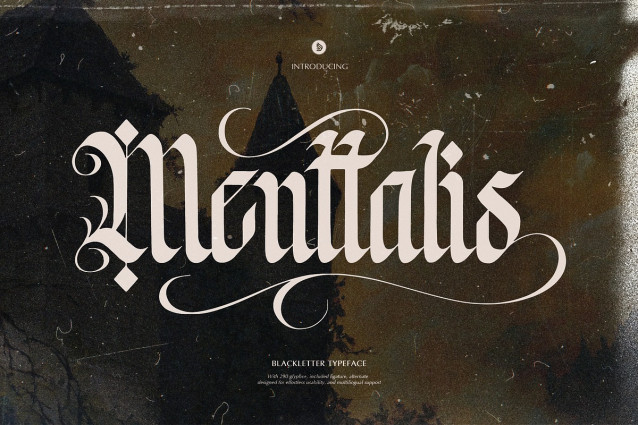 Menttalis Font | Blackletter Typeface, from Denustudios, suitable for any projects such as: logos, branding projects, homeware designs, product packaging, mugs, quotes, posters, shopping bags, t-shirts, book covers, name card, invitation cards, greeting cards, label, photography, watermark, special events, and all your other lovely projects that need a Blackletter Typeface taste.