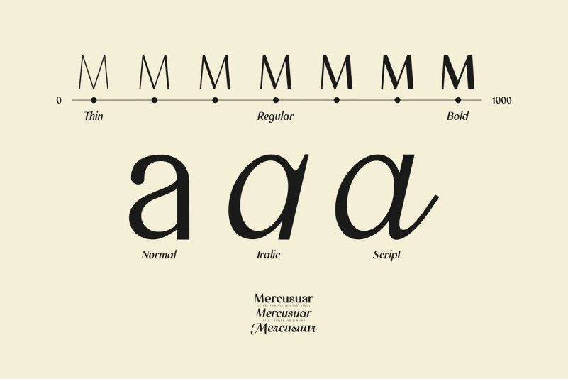 Mercusuar FAMILY font – includes 3 styles (Normal, Current Italic, Script) and 21 boldnesses (Thin, Extralight, Light, Regular, Medium, SemiBold, Bold).