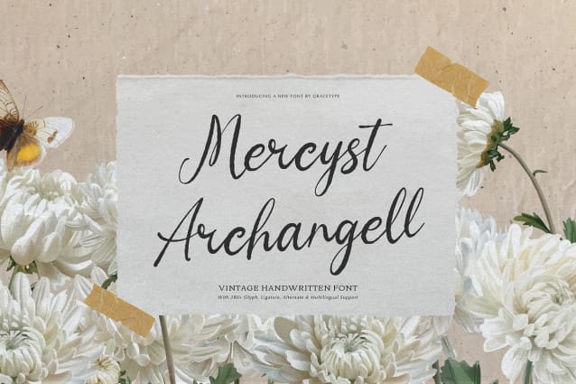 Mercyst Archangell Font – Vintage Handwritten, from Gracetypestudio, suitable for any projects such as: logos, branding projects, homeware designs, product packaging, mugs, quotes, posters, shopping bags, t-shirts, book covers, name card, invitation cards, greeting cards, label, photography, watermark, special events, and all your other lovely projects that need a Vintage taste.