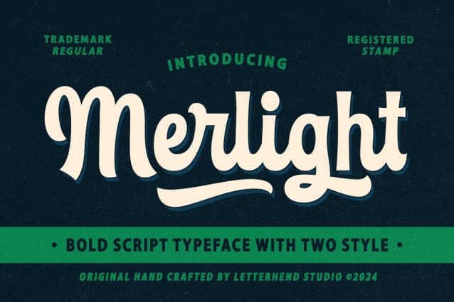 Merlight Script Font a standout bold script with a touch of vintage looks. This type of font perfectly made to be applied especially in logo, headline, signage and the other various formal forms such as invitations, labels, logos, magazines, books, greeting / wedding cards, packaging, fashion, make up, stationery, novels, labels or any type of advertising purpose.