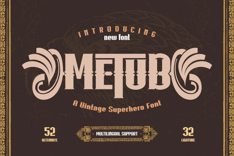 Metub Font, the superhero display font with a unique and powerful serif style that’s sure to make your designs stand out. Each letter is meticulously crafted to convey strength and individuality, making this font the perfect choice for bold and impactful projects. With 52 stylish alternate characters and 32 beautifully designed ligatures, Metub offers endless design possibilities that are sure to elevate your work to new heights.