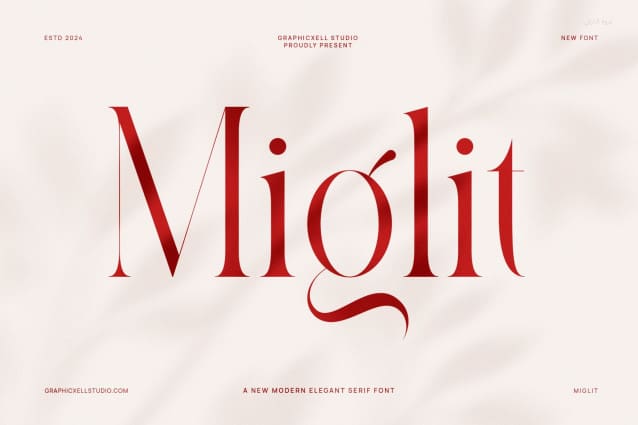Miglit Font is a modern Serif font that brings a trendy touch. It not only looks sophisticated but also charming. What makes it interesting is its delicate curves, which bring an elegant style. The elegant ligature also becomes one of its features and attractions. With calligraphic influences, this font gives a contemporary touch. Therefore, it is perfect for various designs such as beauty designs, elegant creations, layouts, advertising brands, design templates, etc.