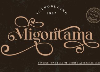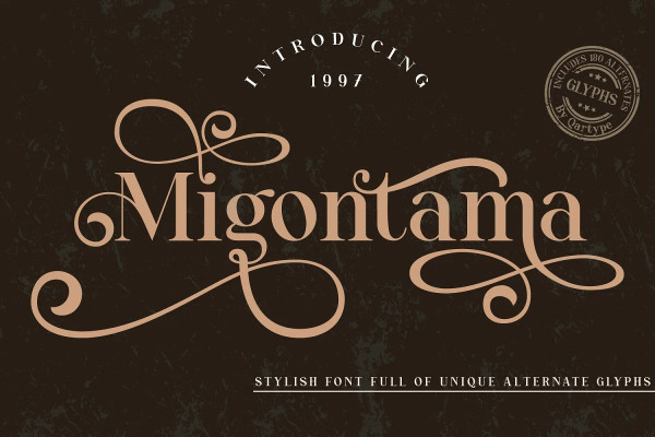 Migontama Font is a stylish modern font with a touch of vintage. It looks amazing at display sizes and is easily readable in text size. Migontama comes with access to your OpenType features, large selection of alternate glyphs (up to 5 for each letter). There are two versions of this font: REGULAR and Bold. Migontama is a display font made mainly for headlines, titles, and other short texts and is well-suited for advertising, vintage mood board, branding, logotypes, packaging, titles, editorial design and modern and vintage design.