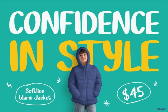 Minaret Font features bold, bouncy letterforms inspired by childhood creativity. In addition, every character feels lively and expressive. The font includes uppercase and lowercase letters, numbers, and basic punctuation. Because of this, it supports many creative layouts. Furthermore, the spacing is carefully adjusted for clarity. As a result, readability stays strong in print and digital use. Meanwhile, the playful style pairs perfectly with bright colors. It also works well with illustrations and photos. Consequently, designs feel energetic and inviting.