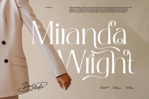 What sets Miranda Wright apart are the last few letters, which feature graceful circular swings that add a touch of charm and uniqueness to the font.. The circular swings at the end of certain letters infuse this serif with a delightful flair. These subtle and graceful details add an air of playfulness and individuality to the font, setting it apart from conventional serif typefaces.