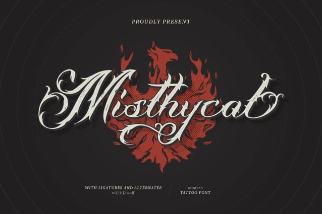 Misthycal Tattoo Font, from Denustudios, suitable for any projects such as: logos, branding projects, homeware designs, product packaging, mugs, quotes, posters, shopping bags, t-shirts, book covers, name card, invitation cards, greeting cards, label, photography, watermark, special events, and all your other lovely projects that need a elegant tattoo style taste.