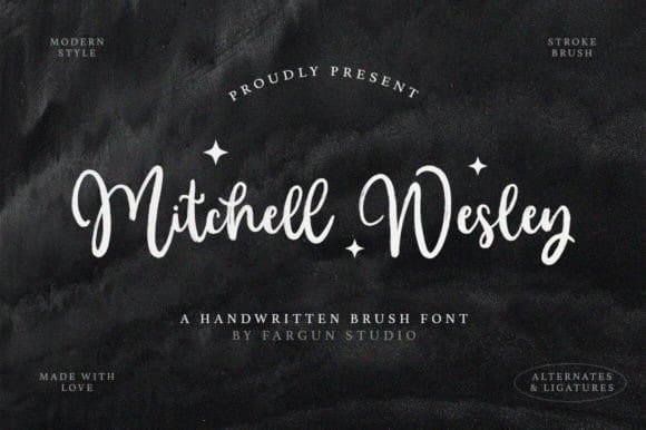 Mitchell Wesley font is made for personal use. Get the full version of the fonts if you want to use it for commercial purposes by purchasing the licenses here: https://creativemarket.com/FargunStudio/91977663-Mitchell-Wesley-Font?u=fontlot123