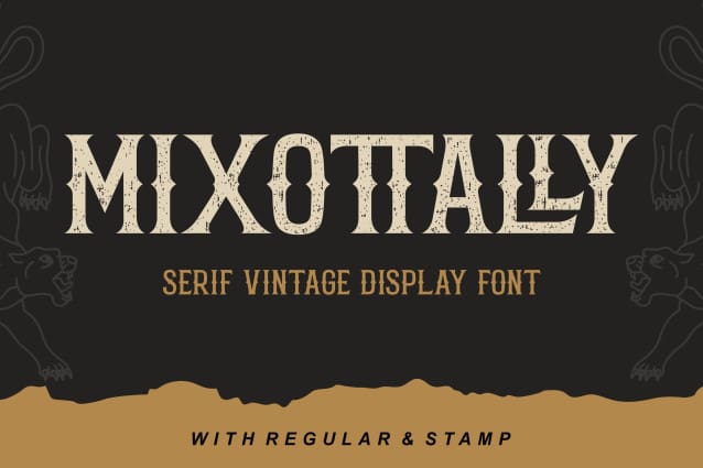 Mixottally Vintage Font – a perfect fusion of vintage and classic themes, available in both regular and stamp styles. The regular style exudes timeless elegance, ideal for branding and logo design. Meanwhile, the stamp style adds a touch of vintage authenticity, perfect for a weathered, classic look. Elevate your creative projects with this versatile font, designed for a range of applications from modern branding to nostalgic designs.